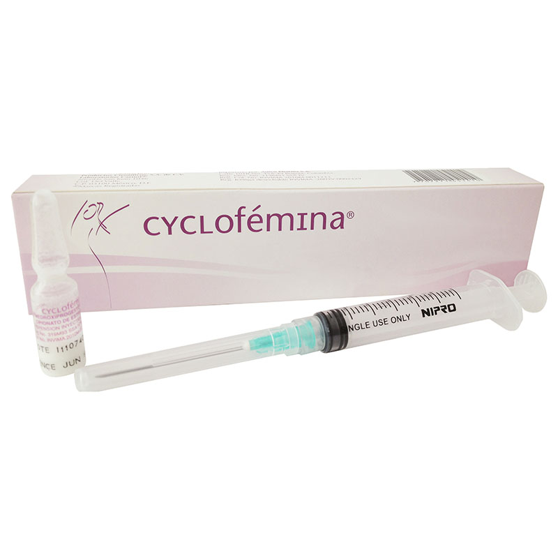 Cyclofémina es un producto que combina medroxiprogesterona y estradiol para prevenir el embarazo. Se aplica intramuscularmente cada mes