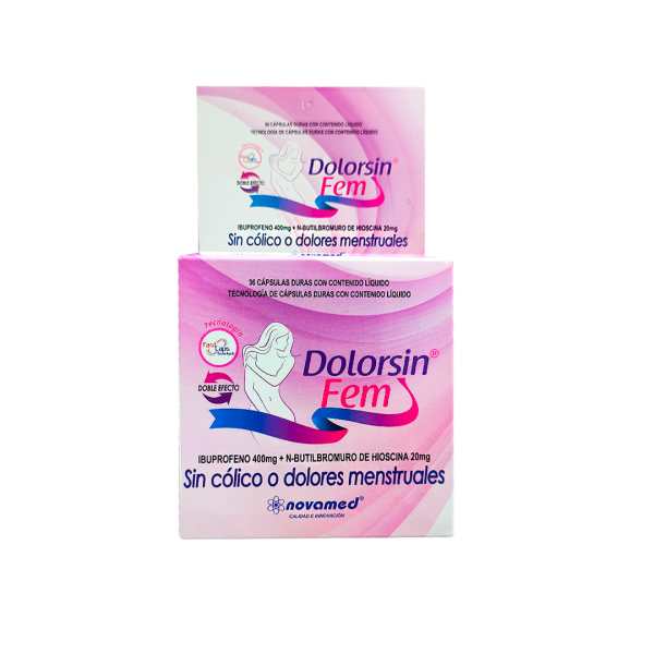 Dolorsin Fem es una cápsula que combina ibuprofeno y hioscina para aliviar los dolores abdominales y uterinos causados por los cólicos menstruales.